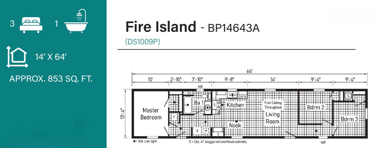 Beacon Prestige Single Section BP14643A, 14×64, 3 Bedrooms, 1 Baths, 853 Sq.Ft.